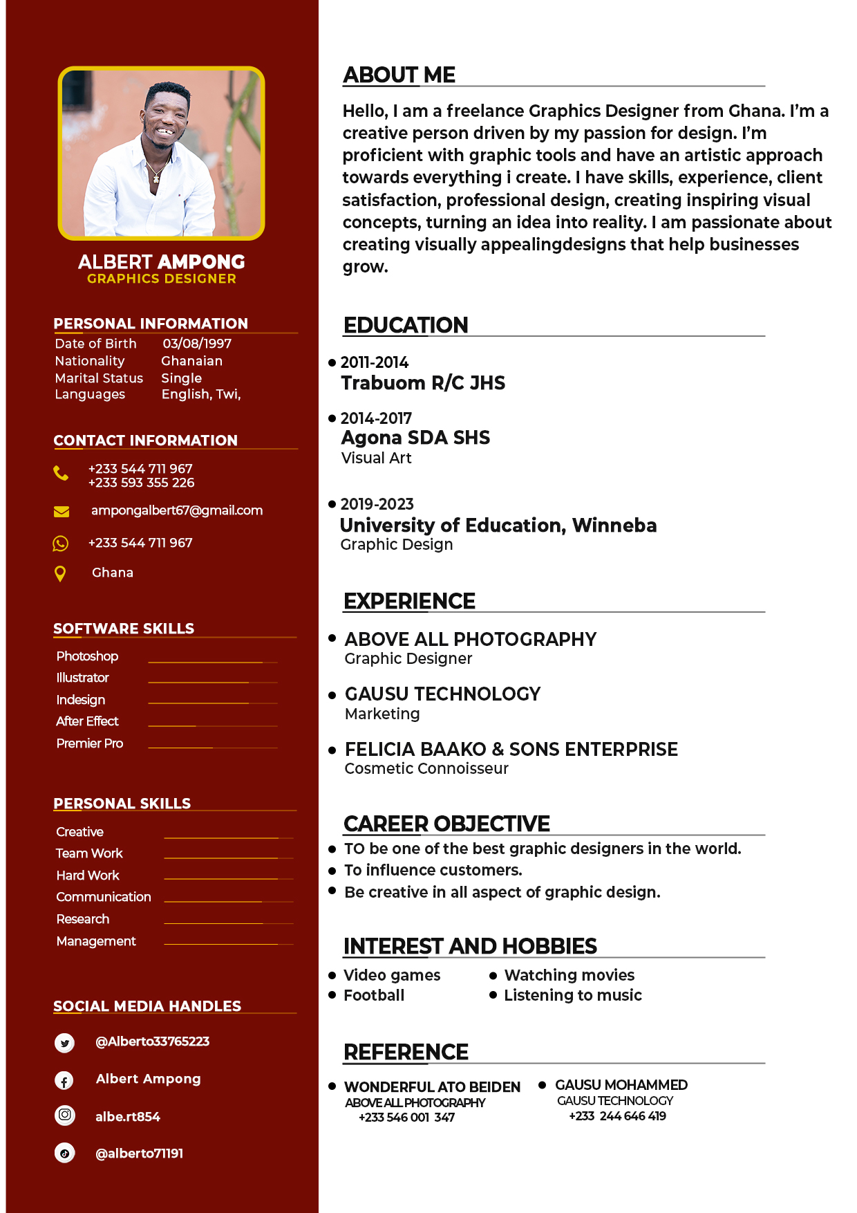 Hello I`m Albert Ampong. I`m a graphic designer and a website designer. If you want any graphic project or any website work for yourself or your business, contact me as soon as possible.